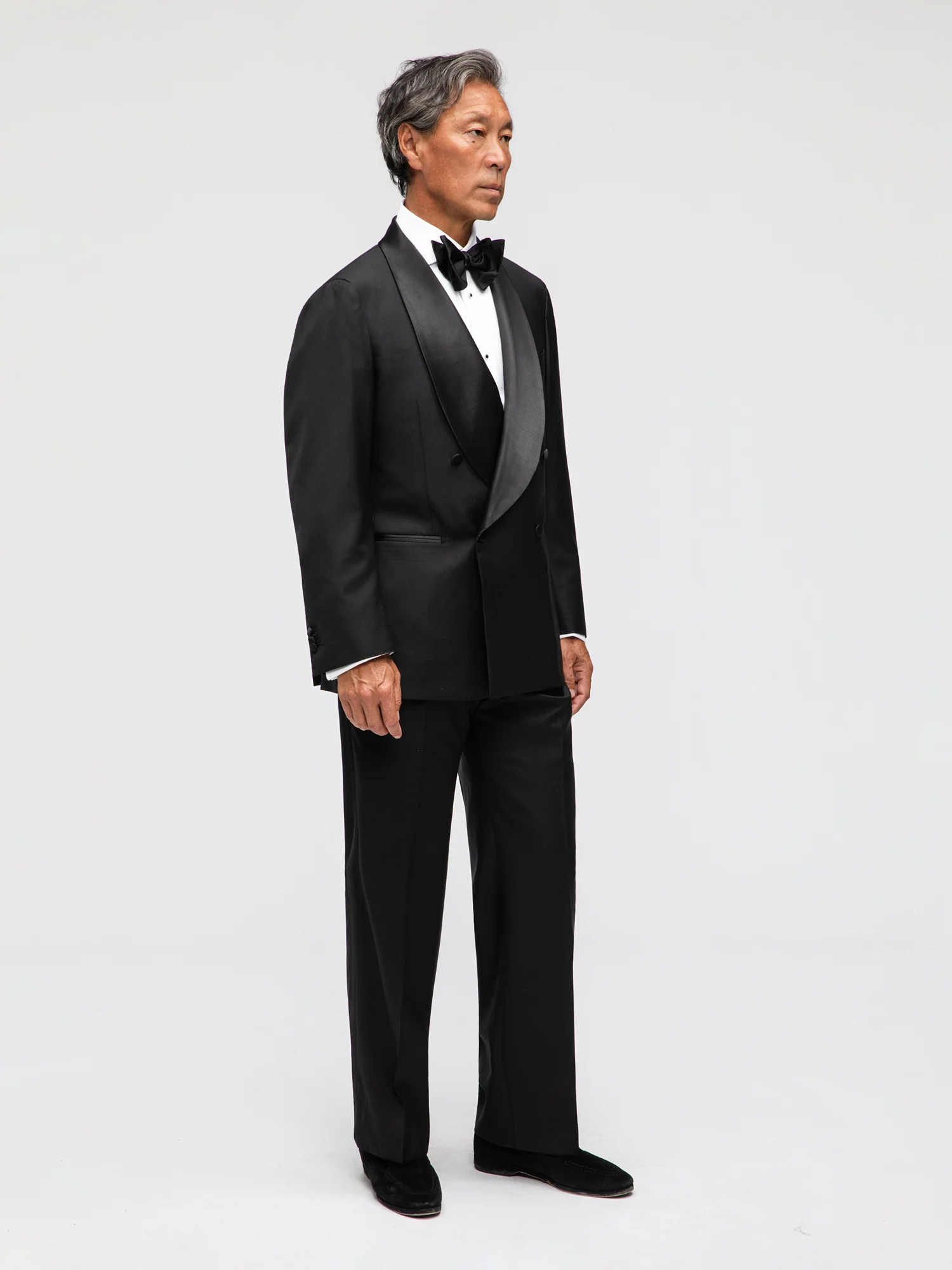 Black Wool Double-Breasted Tuxedo Jacket with 6x1 closure and wide silk shawl lapels. Tailored fit with jetted pockets and unconstructed shoulders. Matched with tuxedo trousers featuring straight closure, side-adjusters, single pleats, silk trimming, and a plain bottom.