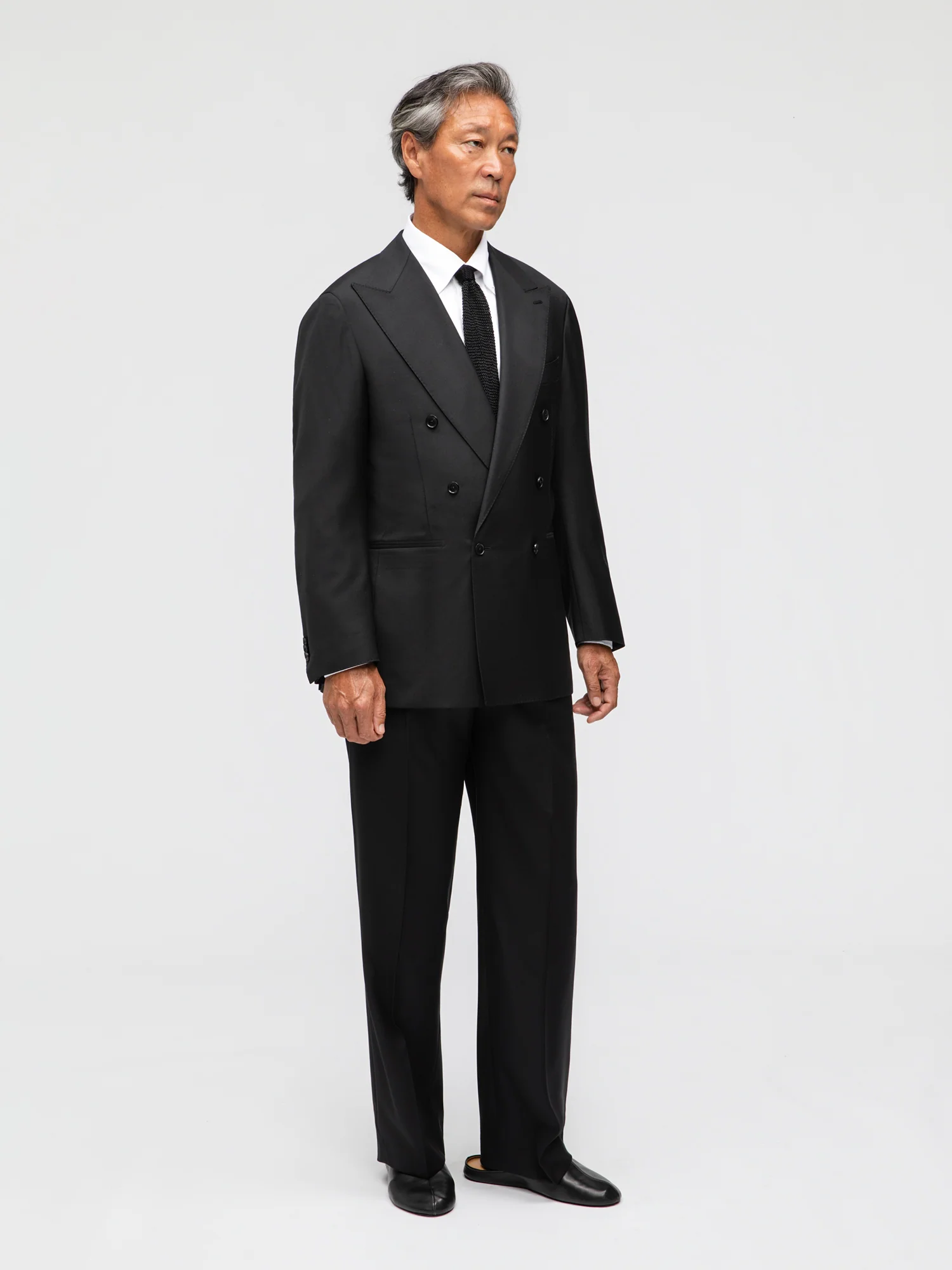 Black Wool Double-Breasted Suit in resilient, crease-resistant worsted wool. Features wide peak lapels, jetted pockets, and unconstructed shoulders for a refined, relaxed look. High-waisted trousers with single pleats, plain hem, and side adjusters complete the set.