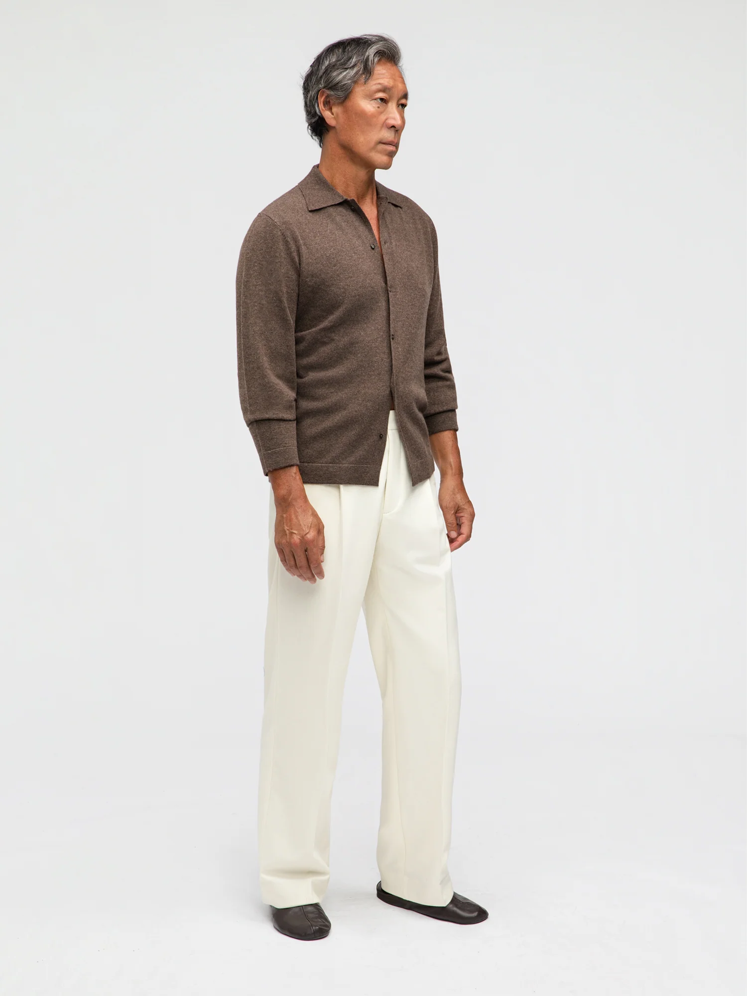 Brown Merino Wool Cashmere Cardigan with semi-spread collar, French placket, and pearl buttons. Gently tapered fit for a timeless, refined silhouette.