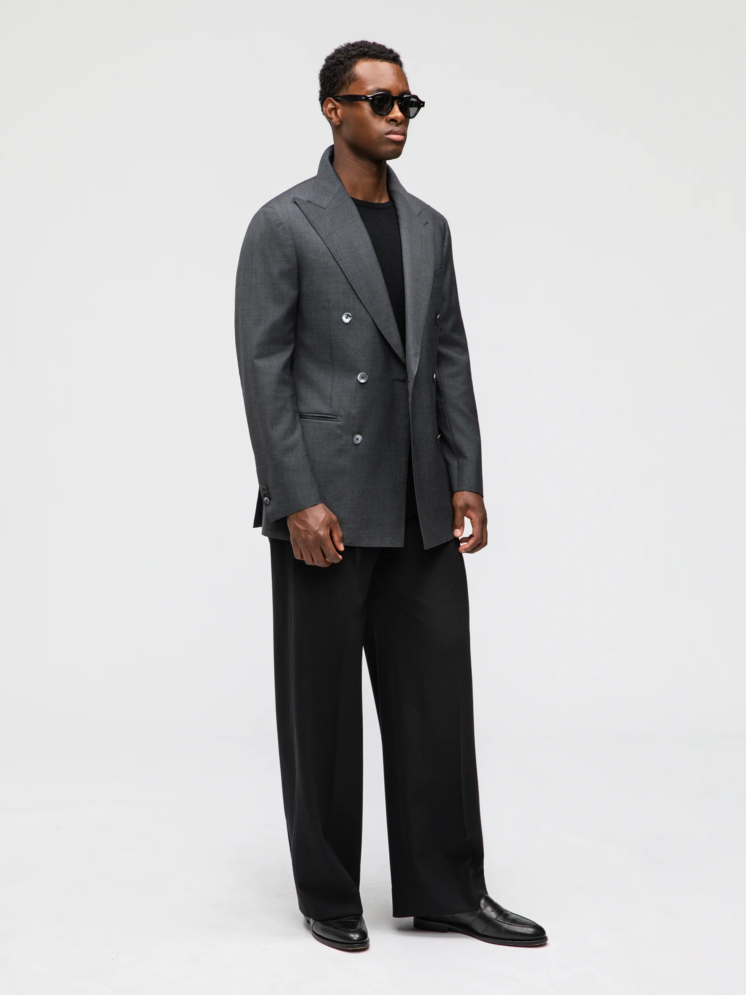 Dark Grey Double-Breasted Jacket in worsted wool. Features wide peak lapels, jetted pockets, and unconstructed shoulders for a refined, natural look. Hand-finished sleeve buttonholes and horn buttons complete the details.