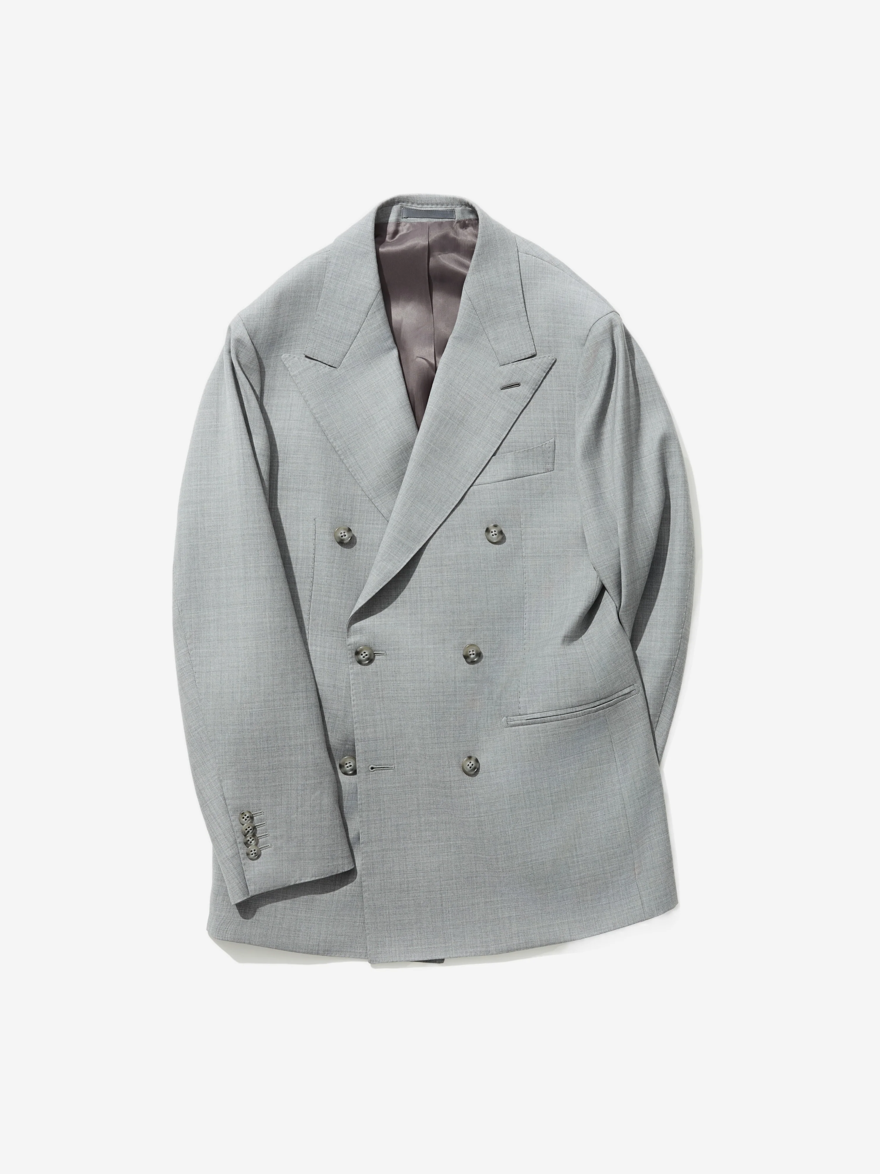 This grey double breasted suit cut from a worsted wool fabric with resilience and crease-resistant functionalities, for a unique degree of wearability. A four season suit that meant to be worn all year around. Features our signature wide concave lapels, jetted pockets and a completely unconstructed shoulder for a refined and natural appearance. Made-by-hand sleeve buttonholes and genuine horn buttons. Matched with a single-pleated high waisted pair of trousers with an overlapping closure. The trousers are straight in the leg, with a just so slight taper fit at the bottom, for a tailored cut.