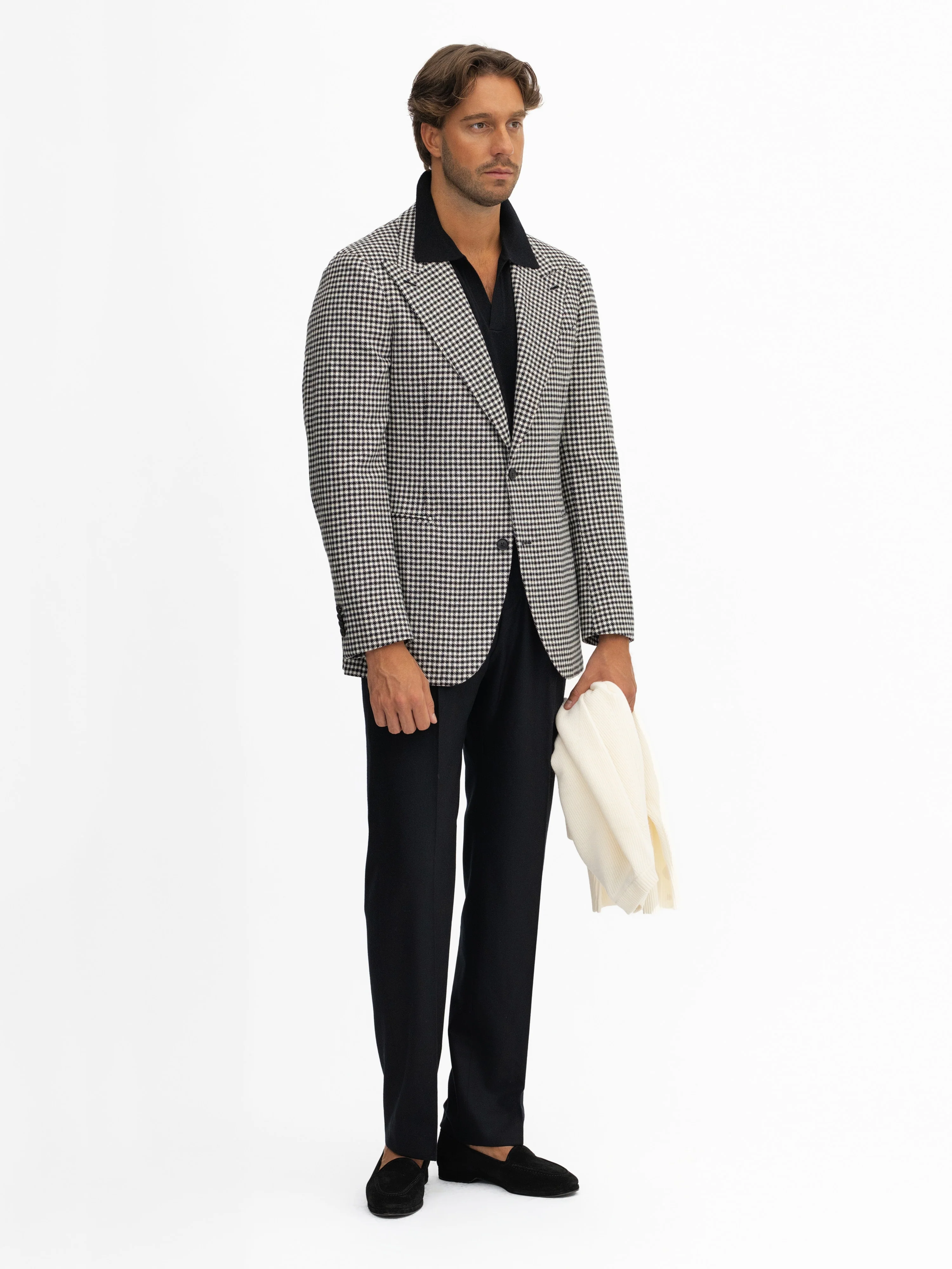 Bold Houndstooth Lambswool Jacket with wide peak lapels and unstructured shoulders. Crafted from soft lambswool. Finished with jetted pockets, hand-sewn buttonholes, and genuine horn buttons.