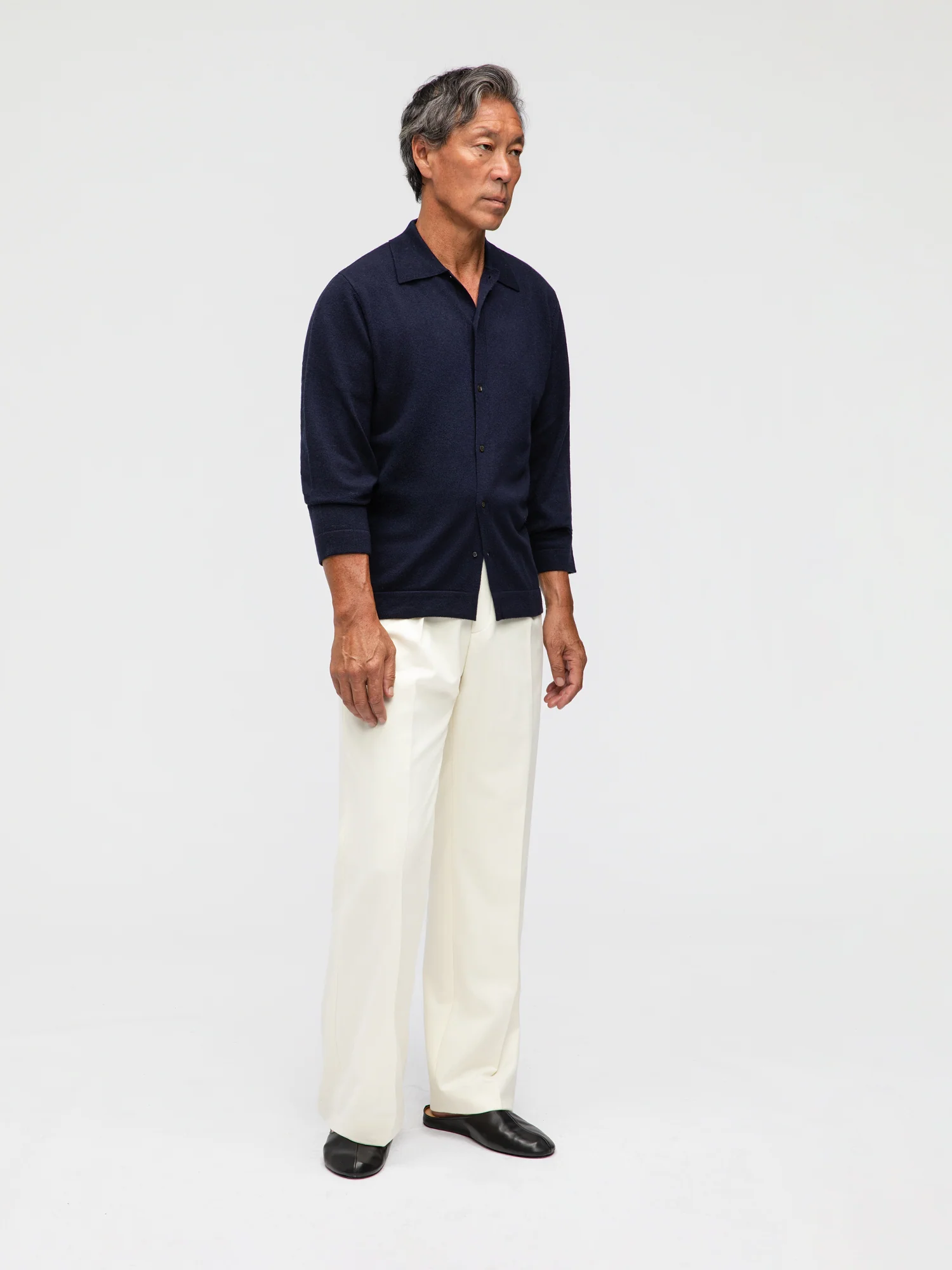 Navy Merino Wool Cashmere Cardigan with semi-spread collar, French placket, and pearl buttons. Gently tapered fit for a timeless, refined silhouette.