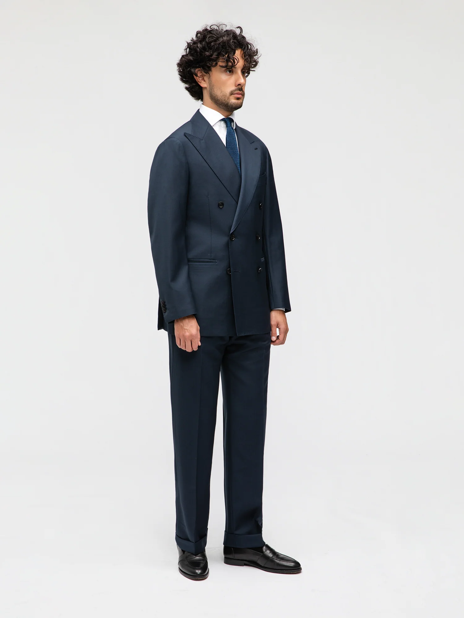 Navy Blue Double-Breasted Suit in worsted wool, combining the jacket and single-pleated high-waisted trousers. Features wide peak lapels, jetted pockets, unconstructed shoulders, and hand-finished sleeve buttonholes for a refined, natural look. Straight-leg trousers with a slight taper complete the tailored silhouette.