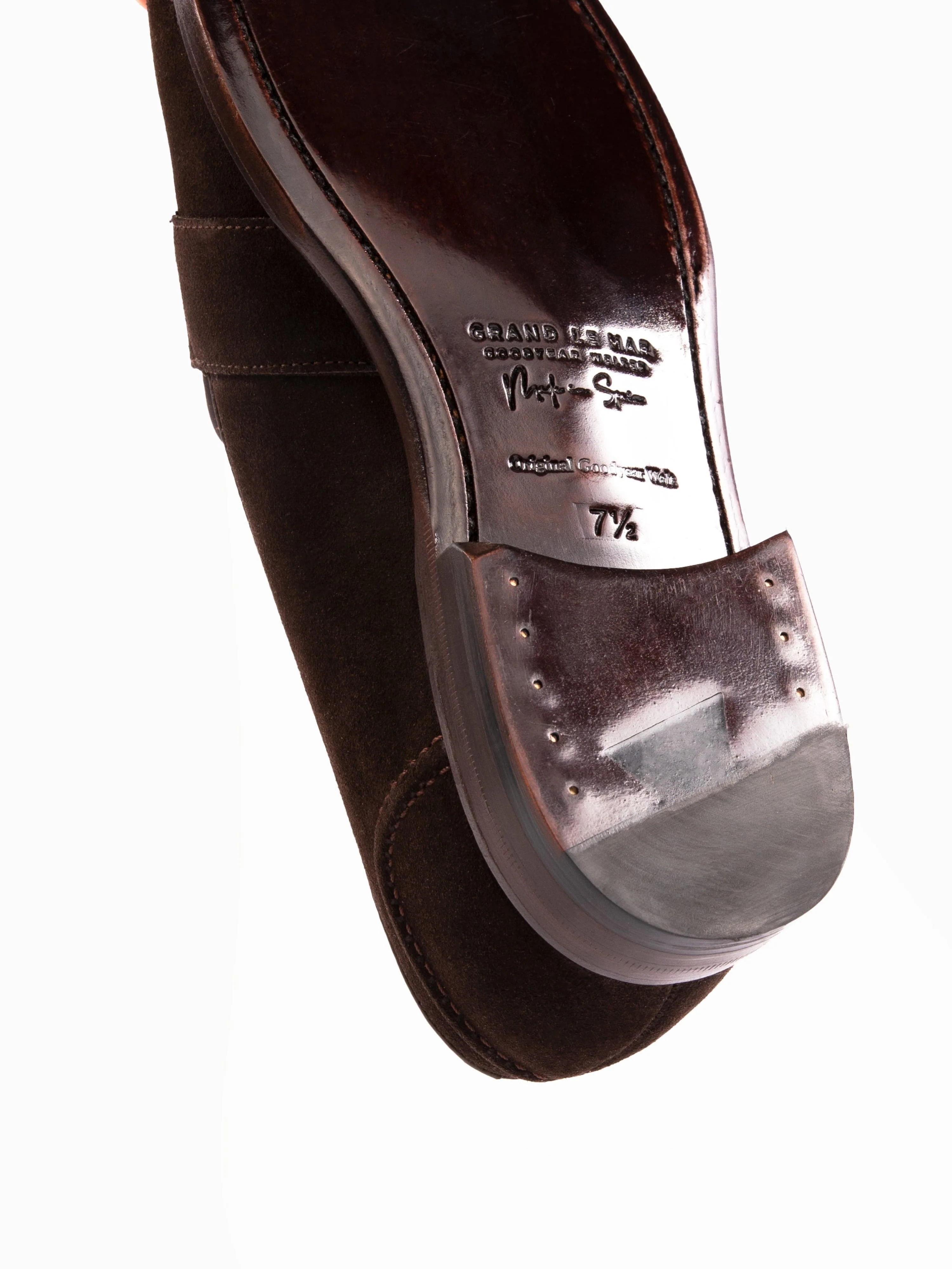 These dark brown suede penny loafers are meticulously handcrafted in Spain, featuring a Goodyear welted construction that ensures durability and comfort. The full leather lining and cork layer inside the sole provide additional support, while five brass intended nails in the toe enhance their elegance. With a rubber heel for protection, these loafers effortlessly combine style with functionality.