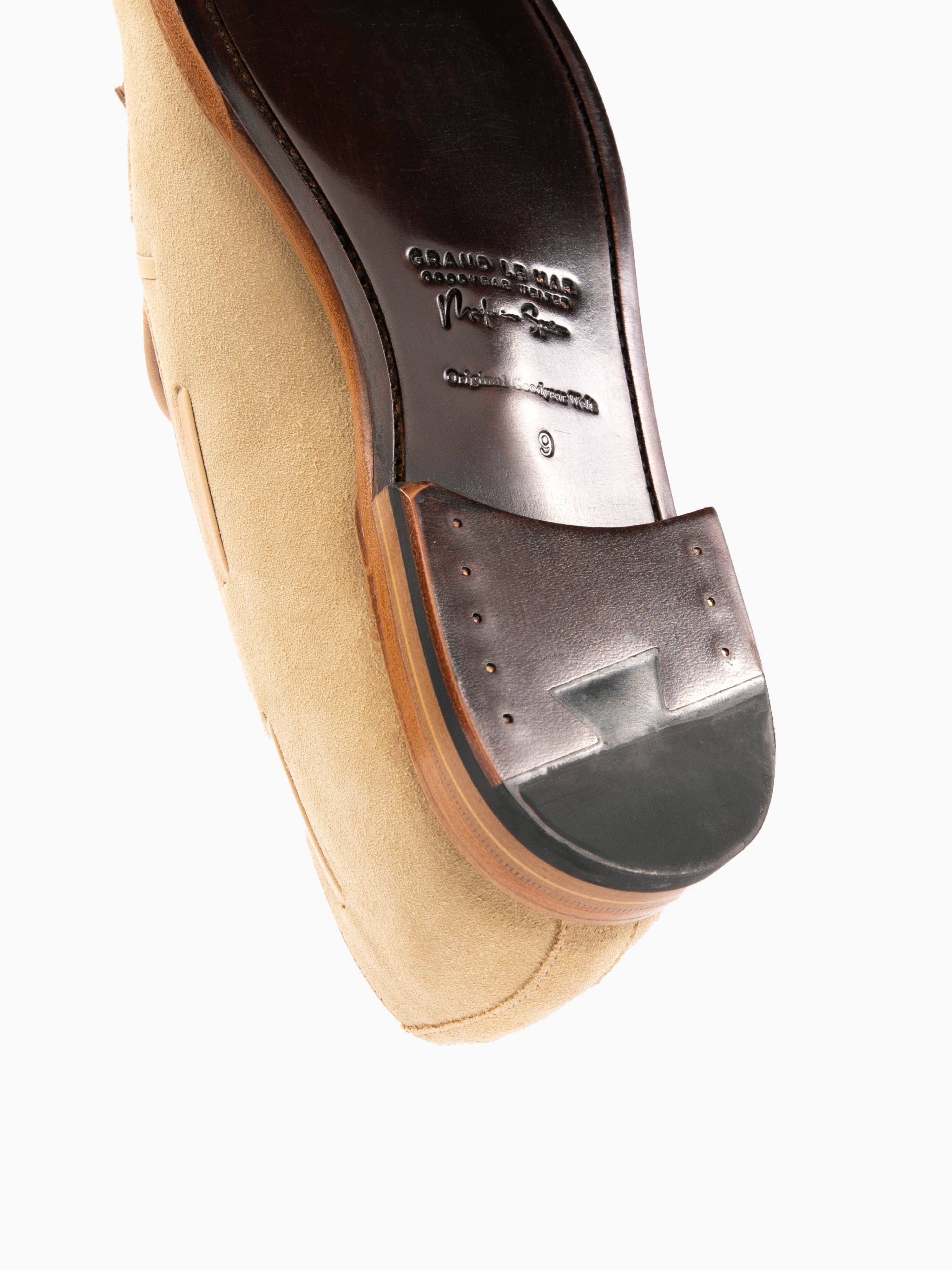 These sand suede tassel loafers, meticulously handcrafted in Spain, combine timeless elegance with modern comfort. Featuring a Goodyear welted construction, these loafers are designed to last. The full leather lining and cork layer inside the sole ensure a comfortable fit, while the beige bow tassels enhance their sophisticated appearance. With five brass intended nails in the toe and a rubber heel for added protection, these loafers are both stylish and practical.