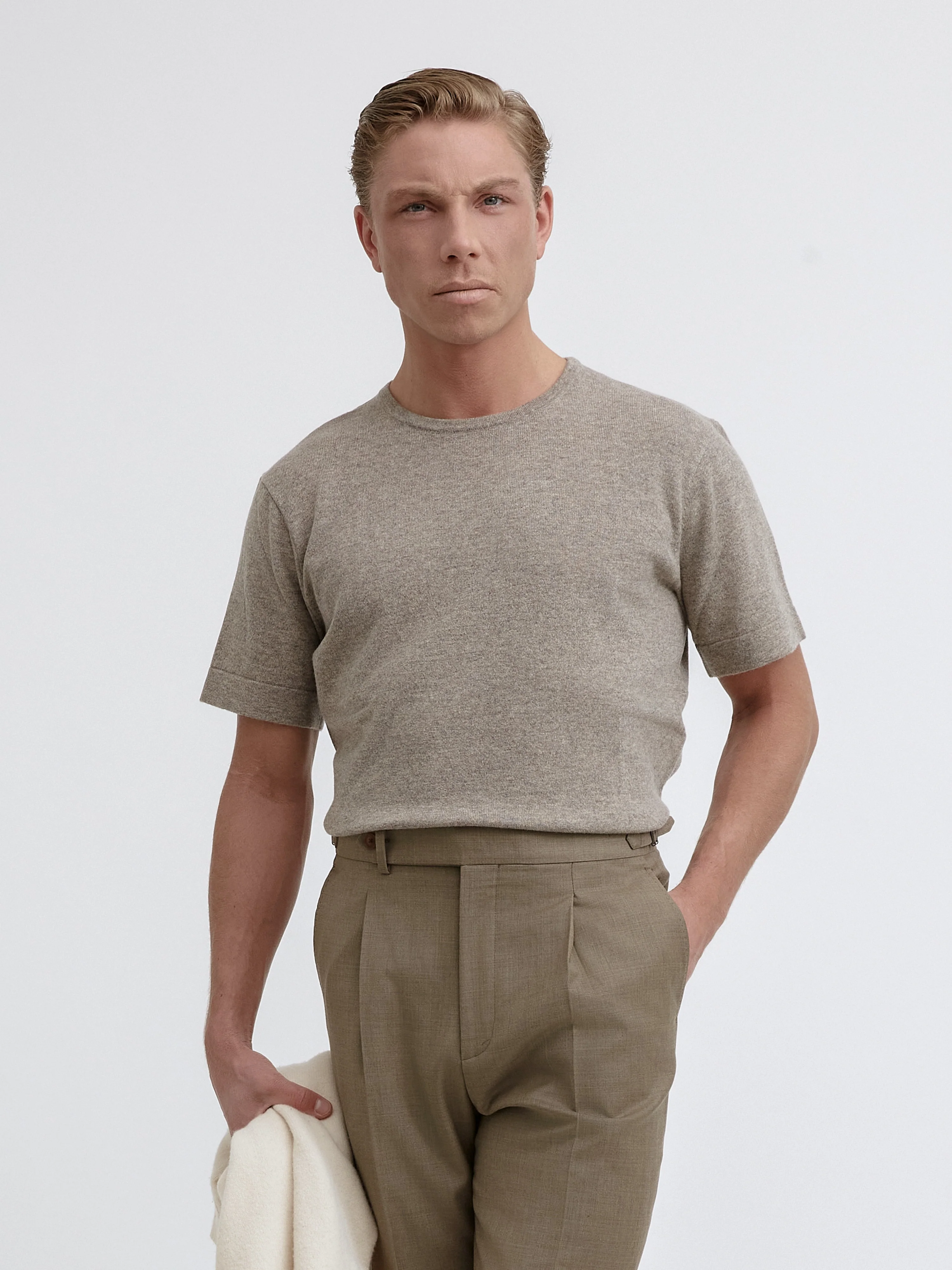 This short-sleeve t-shirt in taupe is crafted from a blend of 80% merino wool and 20% cashmere, offering a soft, comfortable feel for all seasons. The V-opened hem, enlarged cuffs, and slightly narrowed waist provide a modern, refined fit. This versatile piece is perfect for layering or wearing on its own, balancing casual elegance with comfort.