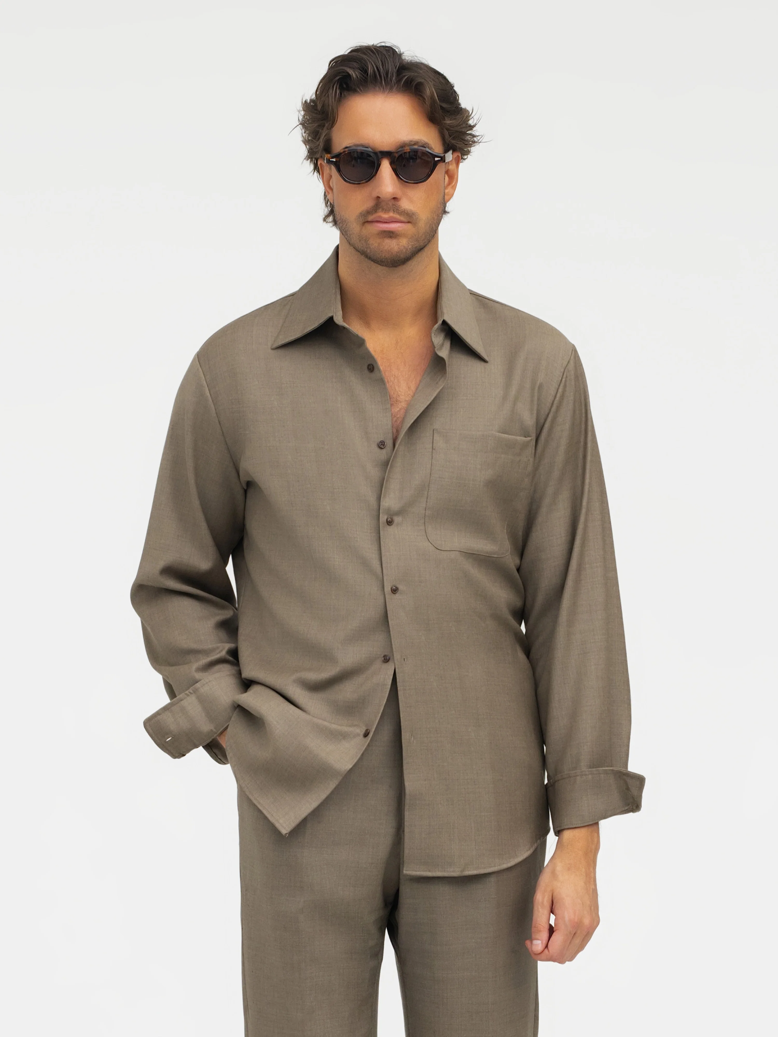 Taupe Shirt in worsted wool. Features a slightly wider cut for a relaxed, refined look. Perfect paired with matching trousers for a coordinated set or worn alone as a dressed-down alternative to a suit.